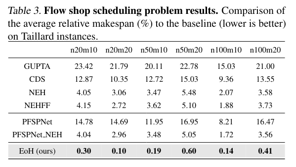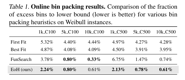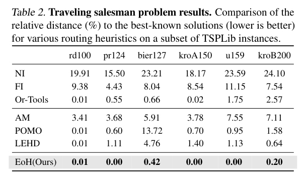 - Evaluation of EoH on three widely-studied combinatorial optimization benchmark problems, where EoH outperforms many existing AHD methods.