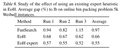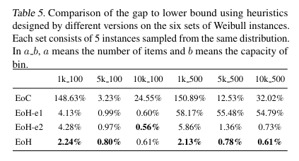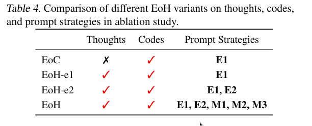 - EoH-e1: it doesn’t use the three modification prompt strategies and E2, i.e. It uses only E1.