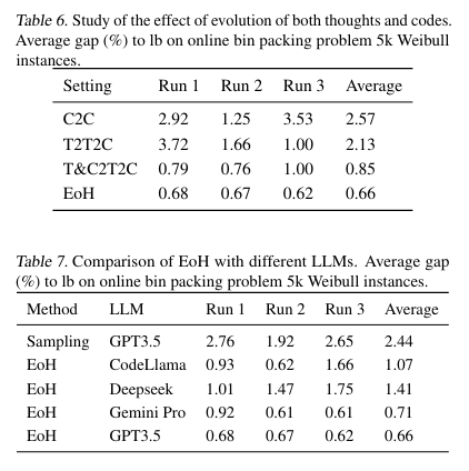 - EoH, a paradigm that uses LLMs to evolution both thought and codes for automatic design of heuristics.
