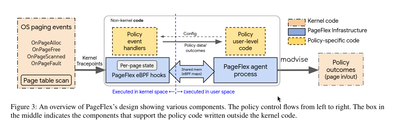 To achieve these goals, PageFlex only externalizes non-critical policy decisions for prefetching and proactive reclamation to user space, while the kernel continues to provide core mechanisms for page access tracking, on-demand page fault handling and page reclamation. PageFlex uses eBPF programs to provide a flexible, low-overhead view of in-kernel memory state to the externalized policy code. More specifically, policies run their performance-critical code inline with the kernel paths using eBPF to flexibly process the page events as they occur, without incurring the overheads of exporting large volumes of page event metadata to user space.