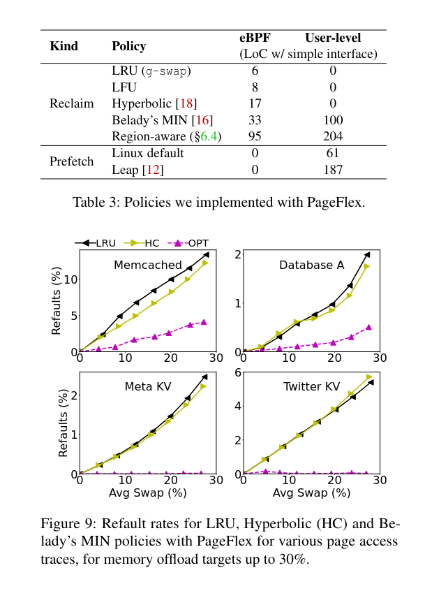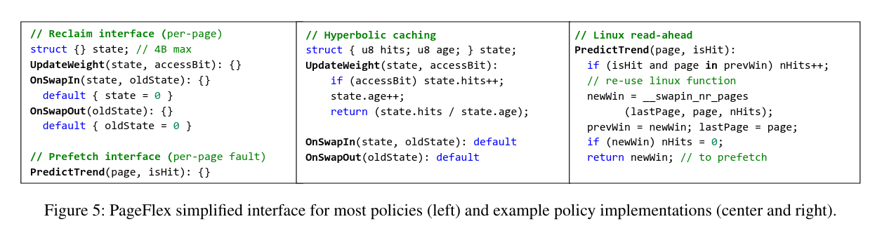 Most new policies in literature, including learning policies like LRB, generally need to maintain per-page metadata. So PageFlex implements additional 4 B state in page struct in kernel, which introduces 0.1% additional memory usage but they claim it’s worth it. This 4B can be used by partitioning it to multiple parts to be used for different purposes.