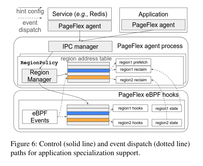 PageFlex extensively uses eBPF maps for eBPF/user space communication. For each policy, they use a BPF_MAP_TYPE_HASH map for policy configuration, BPF_MAP_TYPE_ARRAY map for statistics, and BPF_MAP_TYPE_RINGBUF for event notifications to trigger user-level handlers if needed. Policies may employ maps where needed, too. For policies, they use histograms modeled on hash maps to communicate page weight distributions. Region-aware policy maintains a hash map to store the VMA segment to sub-policy association, which is traversed to find the right policy handler at each event. (Current implementation reserves 256 slots per enclave.)