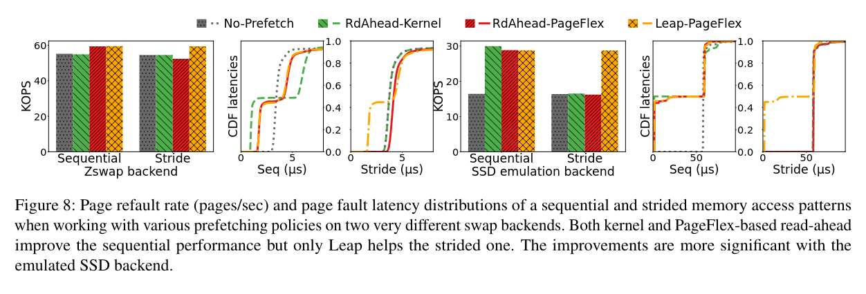 Prefetching policies require page refault history for trend detection and predicting the next pages in the trend to prefetch, and the number of prefetching hits (through minor-faults) to adjust the predictions. PageFlex can provide both the signals with OnPageFault events. Prefetching policies define the PredictTrend function. The function could be run directly in eBPF event handler or in user-level code depending on complexity.