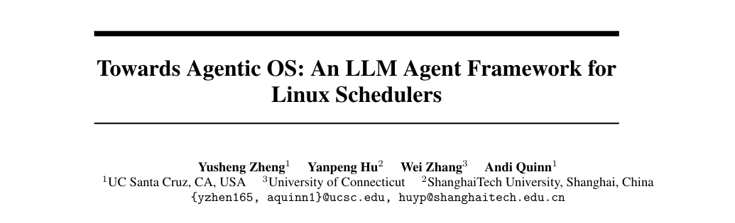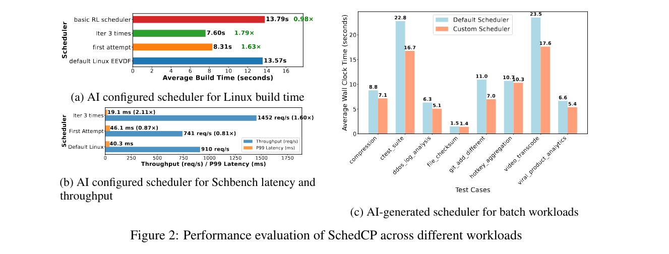 The paper presents SchedCP, a control-plane framework that lets autonomous LLM agents safely optimize Linux scheduling by separating semantic reasoning (“what to optimize”) from system execution (“how to observe and act”). It pairs this with sched-agent, a multi-agent system that analyzes workloads and generates/deploys sched_ext eBPF schedulers, reporting up to 1.79× performance improvement and 13× cost reduction versus naive agentic approaches.