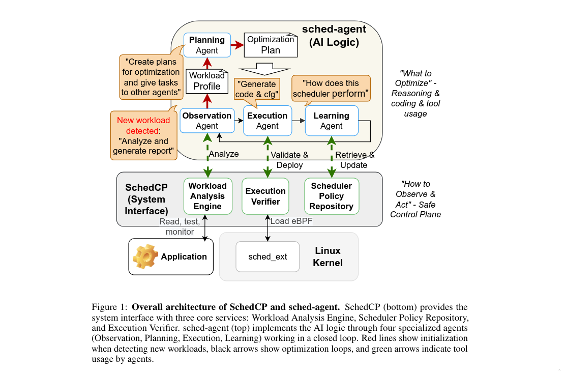 On top of SchedCP, sched-agent decomposes the loop into four specialized agents: Observation, Planning, Execution, and Learning, using separate contexts and tools to iteratively improve a scheduler without retraining. The** Observation Agent** builds Workload Profiles by querying the Workload Analysis Engine strategically, starting with high-level summaries from process name and commands then requesting deeper profiling (perf stat, top) based on findings, synthesizing data into natural language descriptions and optimization goals while managing cost-precision tradeoffs. For kernel compilation, it produces profiles like “CPU-intensive parallel compilation with short-lived processes, inter-process dependencies, targeting makespan minimization.” The Planning Agent transforms profiles into optimization strategies via the Scheduler Policy Repository, following a decision hierarchy: configuring existing schedulers, generating patches, or composing new schedulers from primitives. The Execution Agent manages development, validation and deployment by synthesizing code artifacts, submitting to the Execution Verifier, interpreting results to refine code or fix logic issues. The Learning Agent completes the ICRL loop by analyzing deployment outcomes (e.g., 45% makespan reduction), enabling in-session adaptation and updating the repository with refined metrics, deployment contexts, and documented antipatterns.